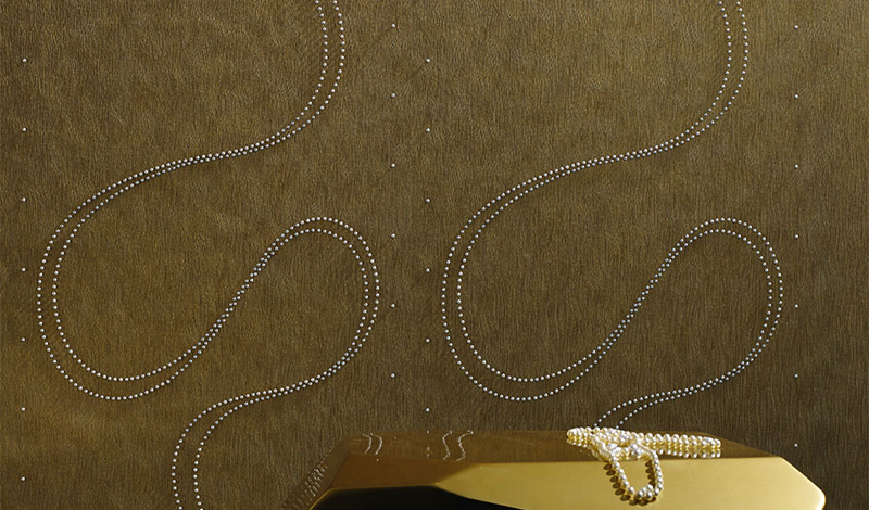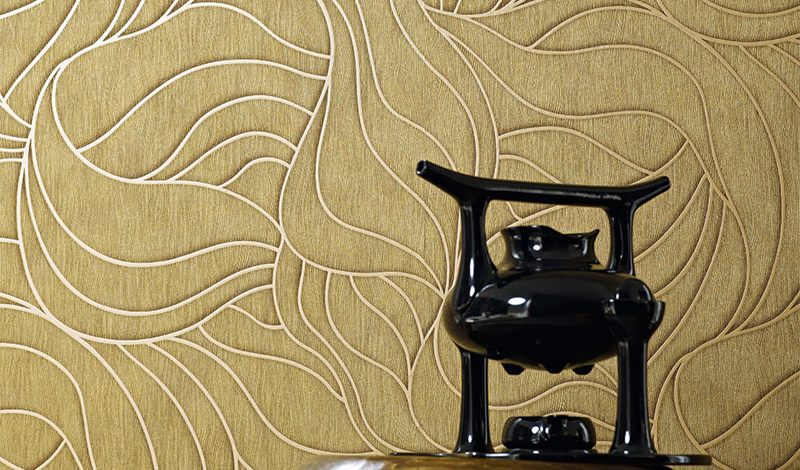 Zlatna boja kao simbol prestiža izražajno ističe sitne šare i nizove na zidovima, dok nešto tamnije nijanse bakra i zlatne boje imaju strukturu arhaičnih krugova u pokretu.